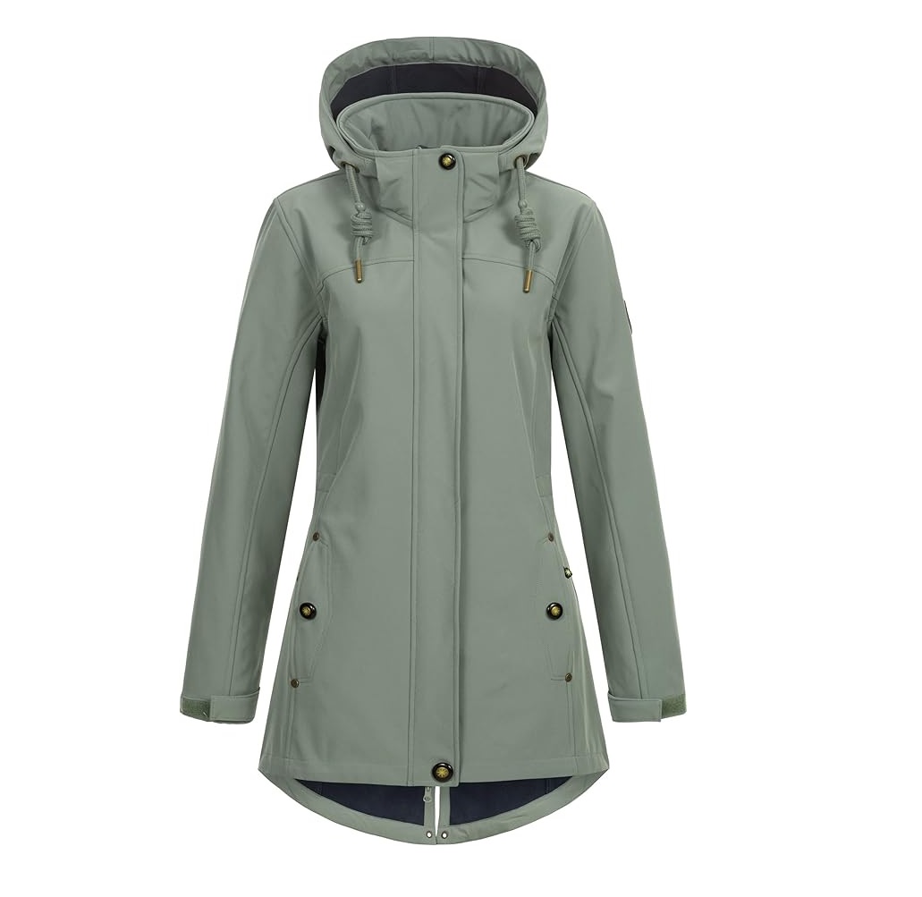 An kalten Tagen wärmt das kuschelige feinflorige Fleece auf der Innenseite den Körper und fühlt sich auf der Haut wunderbar weich an. Der längere Schnitt schützt bei eisigem Wind sogar die Hüfte und ein Stück weit die Oberschenkel. Ein hoch-schließender Kragen und Ärmelbündchen, die mit einem Riegel enger gestellt werden können, wird Wind und Wetter draußen gehalten. Die Kapuze lässt sich in der Weite verstellen und bei schönem Wetter abnehmen. Aufgrund des Softshell-Materials ist die Oberfläche unempfindlich, winddicht und wasserabweisend (Wassersäule 5.000mm). Wenn du bei einer anstrengenden Tour mal ins Schwitzen kommen solltest, wirst du dich über die gute Atmungsaktivität des Materials freuen: die Feuchtigkeit wird nach außen transportiert, damit du ein trockenes Hautgefühl behältst. Der hohe Elasthan Anteil macht das Gewebe elastisch und schenkt dir ausreichend Bewegungsfreiheit bei allen Aktivitäten. Ein praktischer 2-Wege-Reißverschluss gibt dir noch mehr Komfort beim Sitzen und Autofahren.