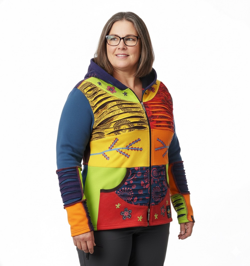 Jede Farbe, jedes Muster wurde mit offenkantiger Technik zusammengesetzt - so entsteht ein Look, der auffällt, ohne laut zu sein. Das weiche Fleece innen wärmt Dich zuverlässig, während der robuste Außenstoff Wind und Alltag trotzt. Die feste Kapuze schützt Dich, wenn es draußen ungemütlich wird.