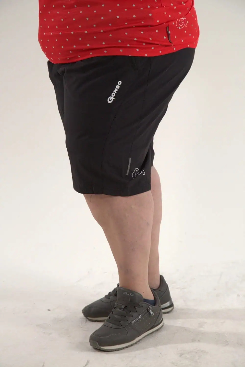 Radhosen mit 4-Wege-Stretch, hoher Rücksprungkraft und breitem Beinabschluss. Entscheidend ist der Schnitt: genug Weite am Oberschenkel, ohne dass Bund oder Beinabschluss einschnüren. Spezielle Übergrößen-Schnitte berücksichtigen das Verhältnis zwischen Bauch- und Oberschenkelumfang besser als Standard-Konfektion.