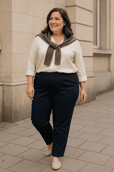 - Gerade geschnittene Hosen: Sie verlängern optisch das Bein und gleichen Proportionen aus. Ideal für den Alltag und im Büro.
