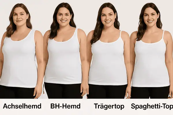 Unterhemd ist nicht gleich Unterhemd – vor allem bei Damen in großen Größen. Je nach Schnitt variiert nicht nur der Look, sondern auch der Tragekomfort, Halt und Einsatzbereich. Hier ein Überblick über die gängigsten Varianten – inklusive Empfehlung, wann sie Sinn machen.