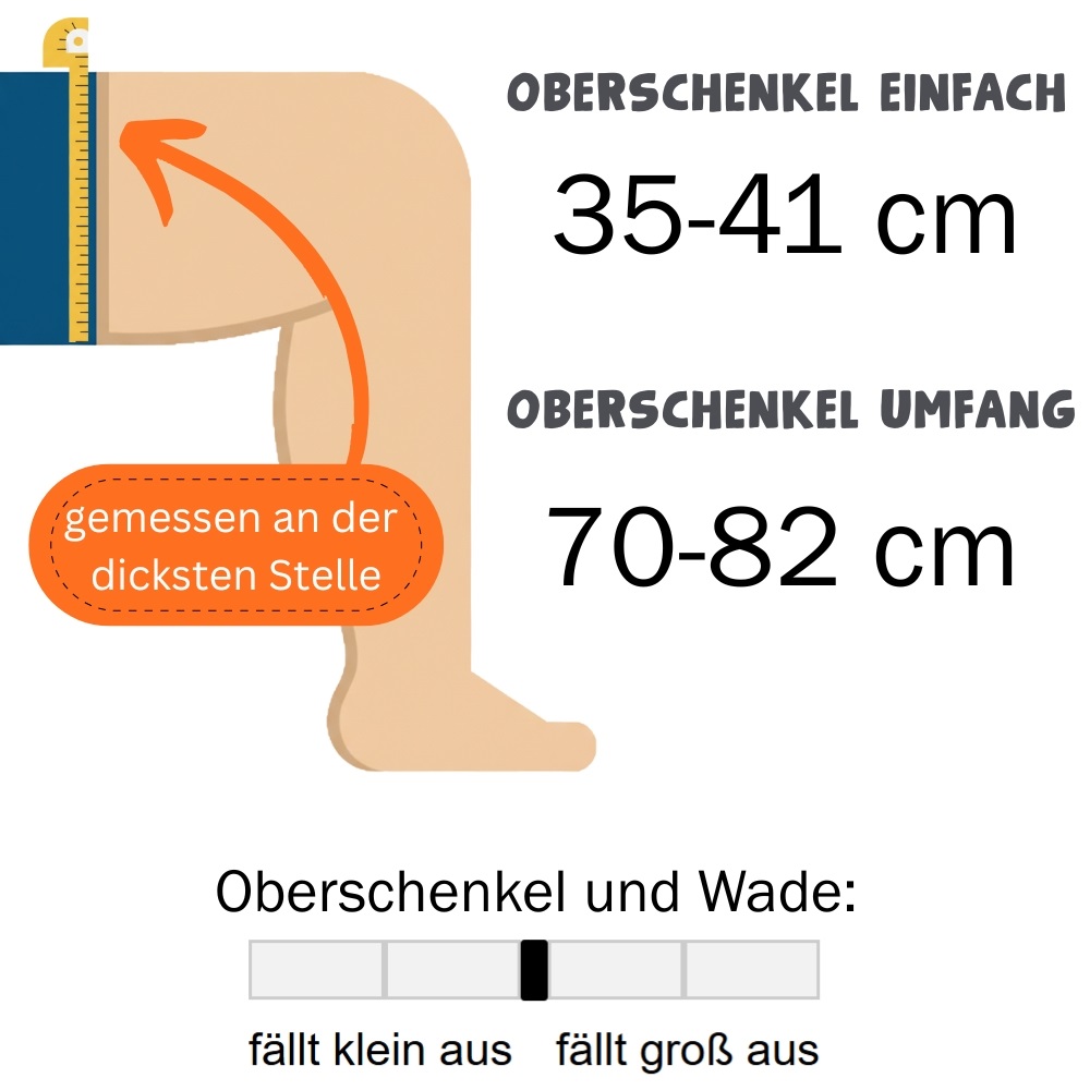 - Oberschenkel: einfache Weite, an der dicksten Stelle. Umfang = cm x 2
