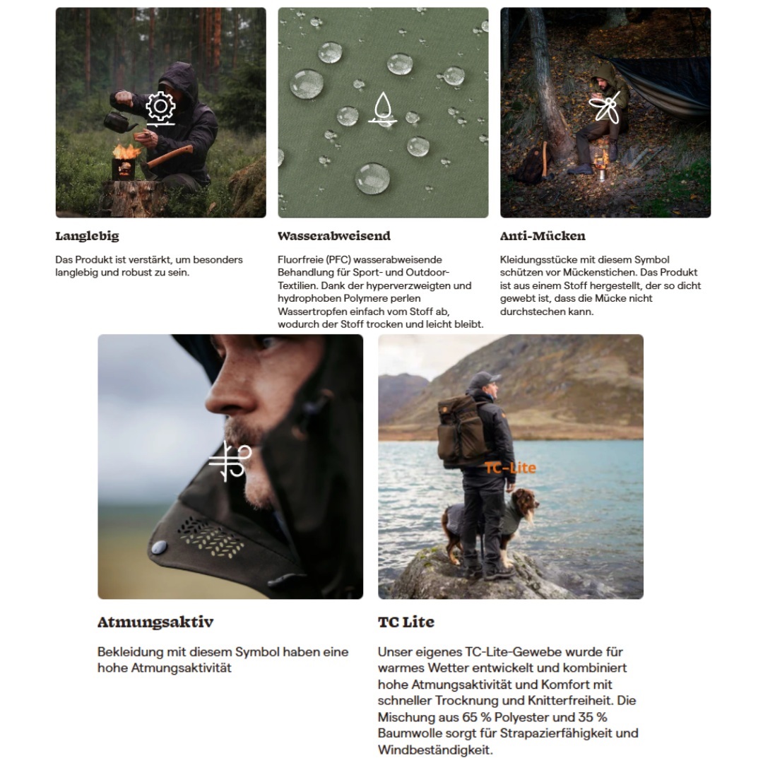 Das bewährte TC-Lite Material ist sehr robust und bequem, außerdem ist es winddicht, wasserabweisend und Insekten bzw. Moskitodicht und schützt auch wirksam vor Zecken.