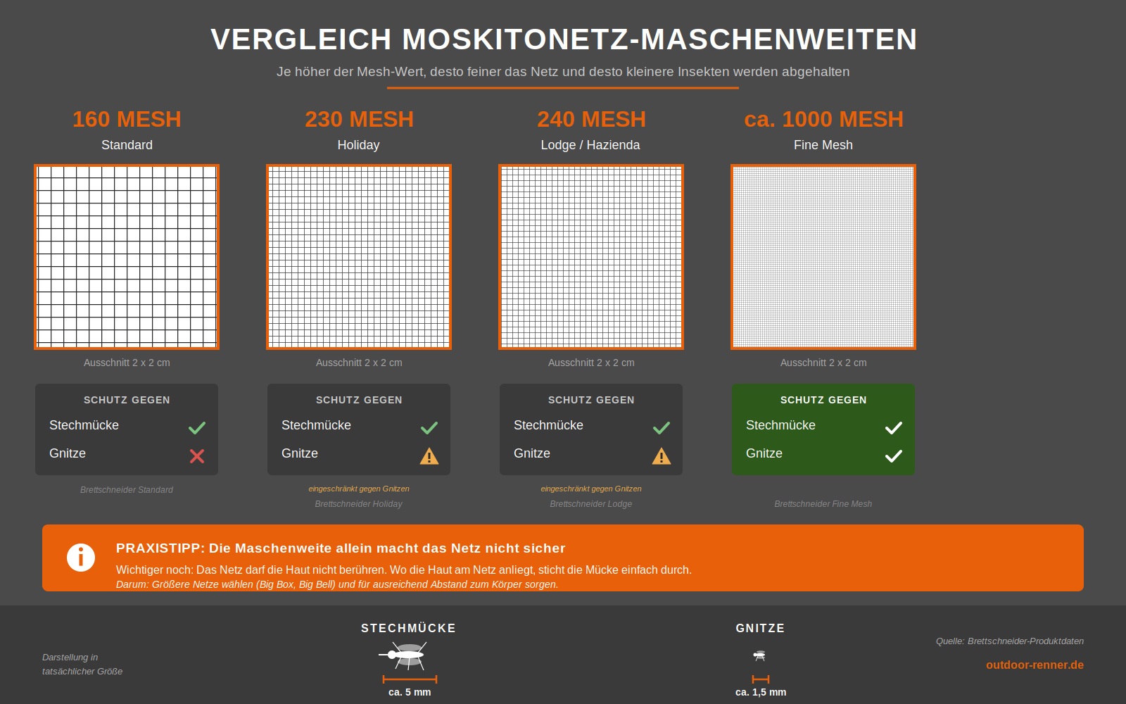 Die feine Maschenstruktur des weißen Polyester-Gewebes lässt die frische Nachtluft ungehindert zirkulieren, während Mücken und Schnaken konsequent draußen bleiben müssen. Dank der vier stabilen Aufhängepunkte und der bodenlangen Seitenwände ist Dein Schlafplatz rundum sicher abgedeckt, damit nichts verrutscht oder Dich beim Umdrehen einengt. Der überlappende Eingang an der Seite macht Dir das Hinlegen und Aufstehen besonders leicht und komfortabel - Na klar, so sieht echte Erholung aus!